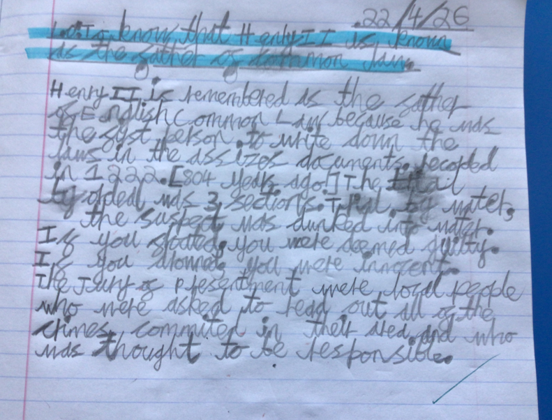 In History, we looked at Law and Power, where we focused on Henry II and his influence under today's law and power. We discussed how previously people were trialled by ordeal either by fire, water or combat. We discussed whether we thought these trials were unfair or not.