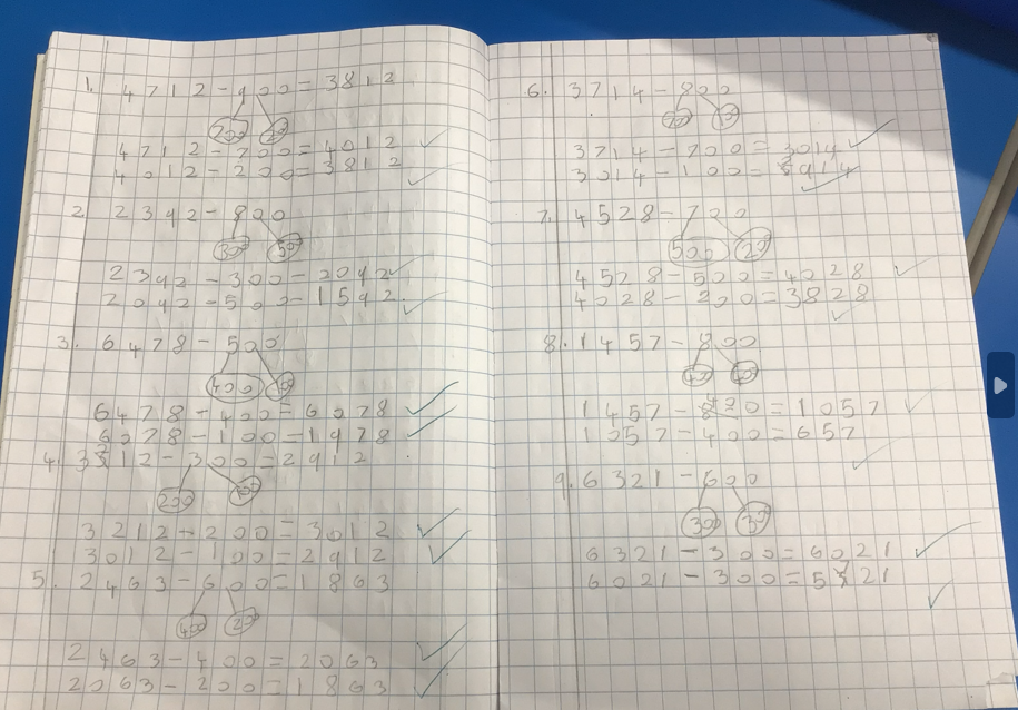 In Maths, we have been looking at subtracting 1s, 10s, 100s and 1000s across a boundary. We have looked at partitioning numbers, using our knowledge of number bonds to support this.